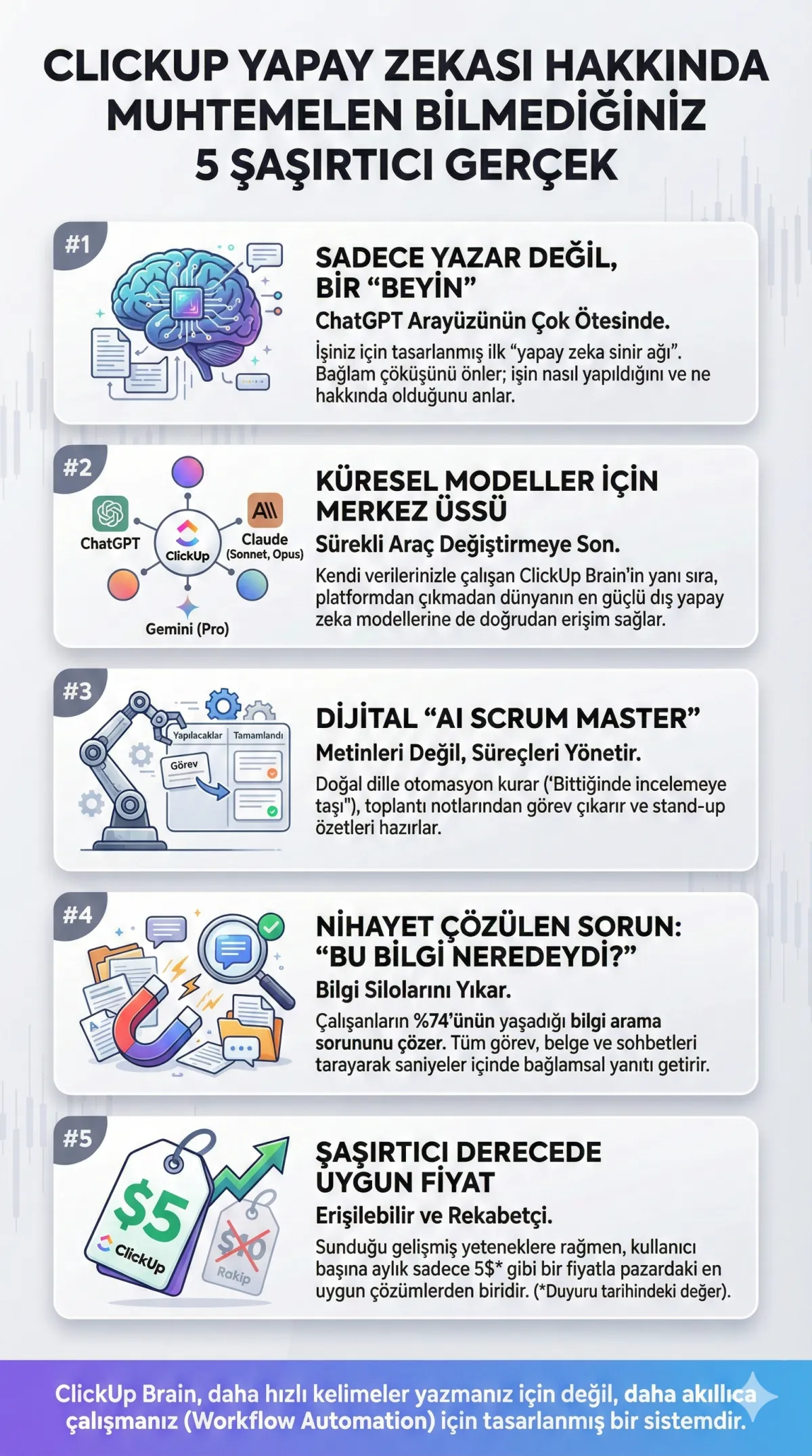 "ClickUp Brain, işinizi yaptığınız yere derinlemesine entegre edilmiştir; işiniz, iletişiminiz ve bilginiz arasındaki boşlukları doldurur ve noktaları birleştirir."